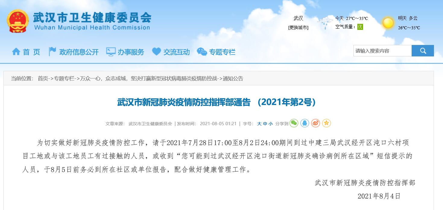 人民網武漢8月5日電 8月5日凌晨1點21分,武漢市衛健委發布通告稱,為切實做好新冠肺炎疫情防控工作,請於2021年7月28日17:00至8月2日24:00期間到過中建三局武漢經開區沌口六村項目工地或與該工地員工有過接觸的人員,或收到“您可能到過武漢經開區沌口街道新冠肺炎確診病例所在區域”短信提示的…[詳細]