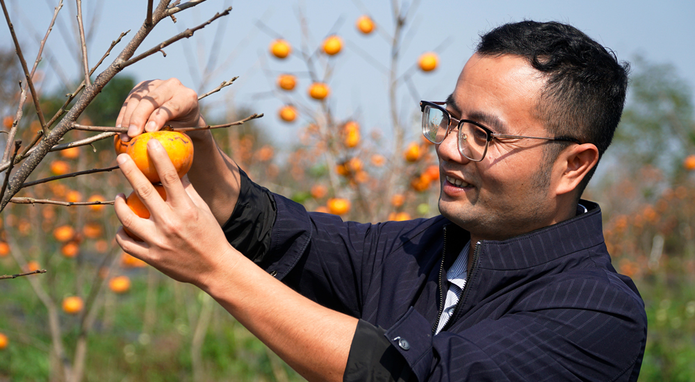 全國農業農村勞模張朝於果園採摘柿子的瞬間。呂巍 攝