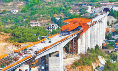 4月6日,湖北十堰市鄖陽區茶店鎮櫻桃溝村西十高鐵(西安至十堰)櫻桃溝特大橋合龍。