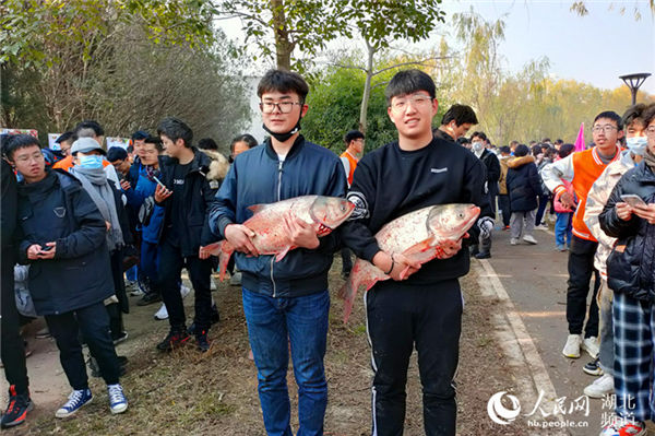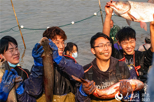12月20日,武漢科技大學黃家湖校區沁湖邊上鼓點陣陣,在拉網師傅的吆喝聲中,漁網漸漸收攏,湖光瀲灩中,時有大魚躍出水面。來自該校各個學院的18位學生志願者身著捕魚衣,站在岸邊,向湖中拋洒漁網,一條又一條大魚被拉拽上岸,引起圍觀師生陣陣驚呼。