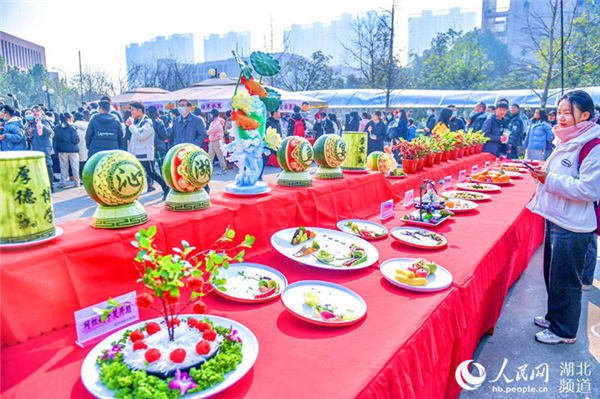 上午11時許,在該校南苑食堂門前廣場紅綢布覆蓋的長桌上,雕著武科大校訓“厚德博學,崇實去浮”的冬瓜和“沁湖魚宴”四個大字的西瓜格外吸引人眼球。