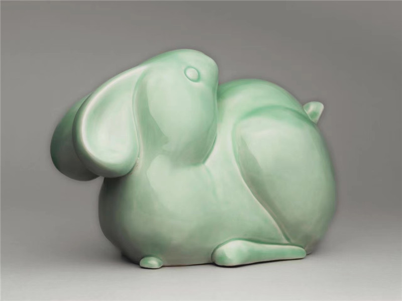 據介紹,一款名為《望月》的瓷兔,靈感來自宋代影青瓷雕塑或斗笠碗內的嬰戲圖,釉面呈梅子青,與宋代湖田窯血脈相通。其造型看似隨意,卻別具匠心:小兔子長耳短尾,體態小巧,溫文爾雅,酣臥之際,忽而精靈可愛地回首一望。這回首一望,一瞬間突破了雕塑的靜態和空間的拘束,打開了作品的時空想象力,形成與觀者之間妙趣橫生的互動。