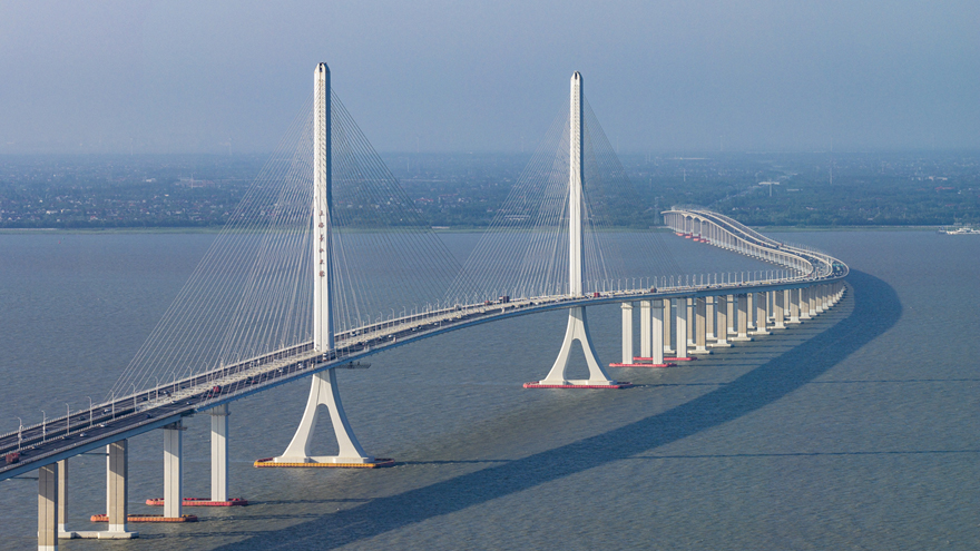 淡蓝天幕下,上海长江大桥如白玉带横贯长江口斜拉索似银弦轻拨流云。江面倒映着桥塔的纤细身姿,车流、光轨在冷调画面中划出有序音符,展现超级工程与自然意境的静谧对话。