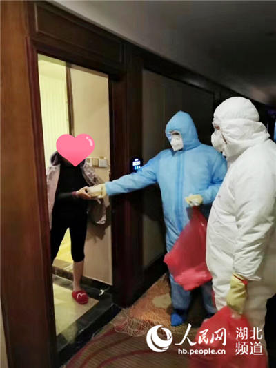 隔离点宾馆共5层楼,第一层是大厅,二层是医户人员办公区 ,第三至五层住的是隔离人员。每天8:20、11:30和17:30,送餐队员们要准时为隔离点人员送去早中晚三餐。按照排班,他们两人一组分三班工作。每个房间居住的疑似病人会把垃圾打包放在门外,每次送完餐后队员们会再一间间房地去清理门外打包好的垃圾。收完垃圾后,疾控人员对走道、房间进行全方位消毒。除了送餐,队员们还会应病人要求充当跑腿采买的快递小哥,为其采购生活必需品和药品。