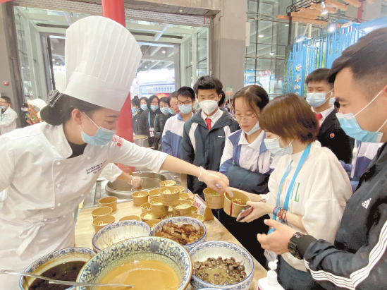 “加油!热干面!”一碗碗香气扑鼻的热干面,在展示区的“湖北馆”前免费派发,观展群众排起长队。