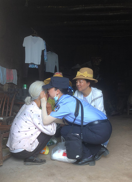 一路舟车劳顿,翻山越岭。爱心小分队到达龙口村,这是一对失独老人,70多岁的老胡领着哑巴老伴儿在太阳底下盼着大家的到来,哑婆婆穿着一件花衣服开心得像个孩子,挨个拉着大家的手。当她接过送给她的新衣服,便套在身上试穿起来,用手比划着民警带的相机,示意给她拍照片。近年来,在爱心小分队的开导与帮扶下,老人渐渐从悲痛中走出来了。老胡说,“今年冬天的红橙销售还是拜托大家了。”大家欣然允诺。